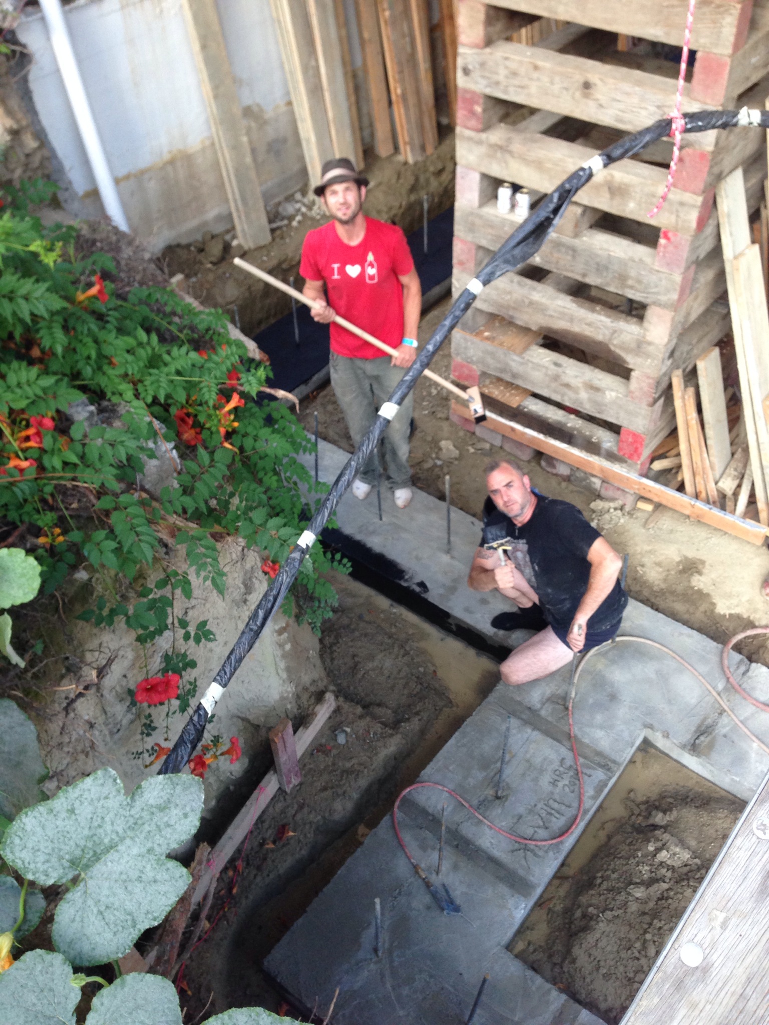 Our friend, kEvin has been here this week helping out– his alternative to Burning Man this year. It was an awkward week for it, unfortunately, because of the pauses in action just before and then after the concrete pour (waiting for it, then waiting for it to cure), but he has been here this weekend to “make up” for those pauses, doing some of the more back-breaking labor that is beginning to really wear on Morgan. THANK YOU KEVIN!!