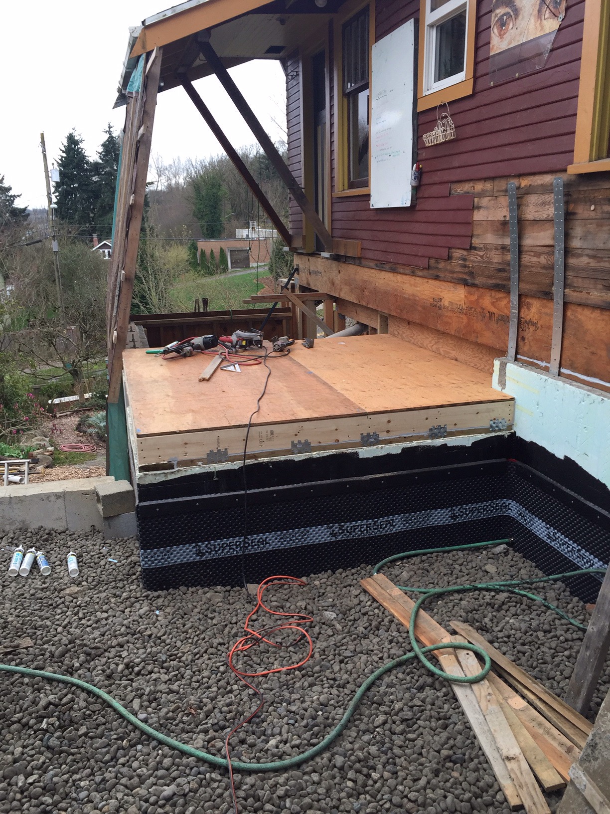 Barbara and Thomas came over and puzzled some tricky bits with Morgan, and then they actually started putting boards up. This after demolishing the roof of the back porch, leaving us vulnerable to rain until that chunk gets finished again.