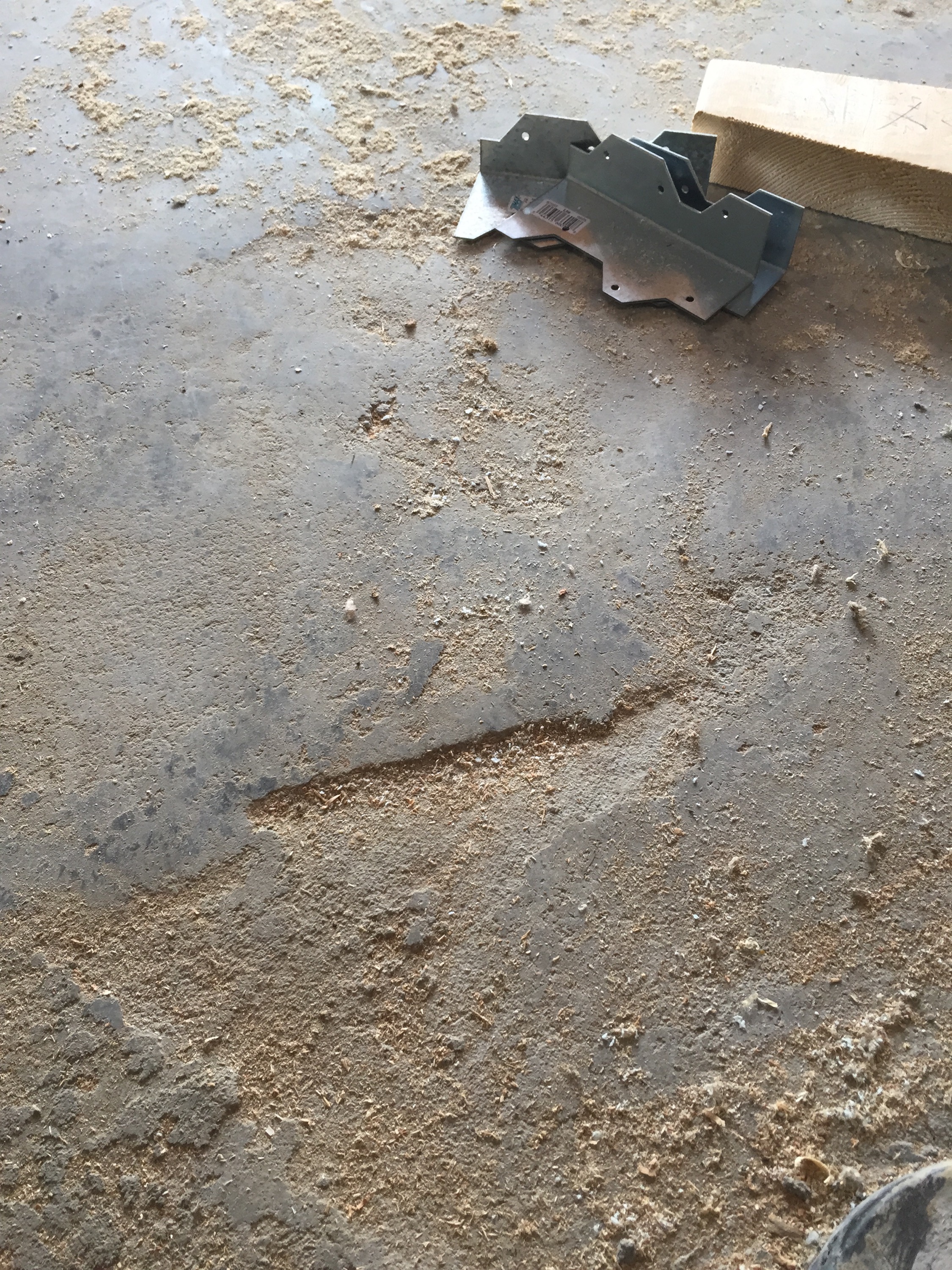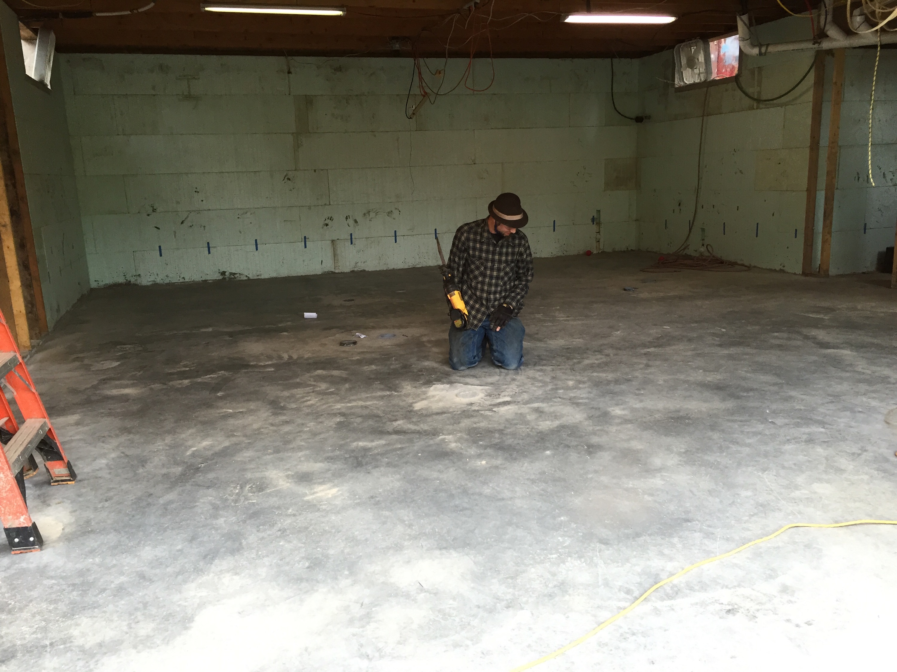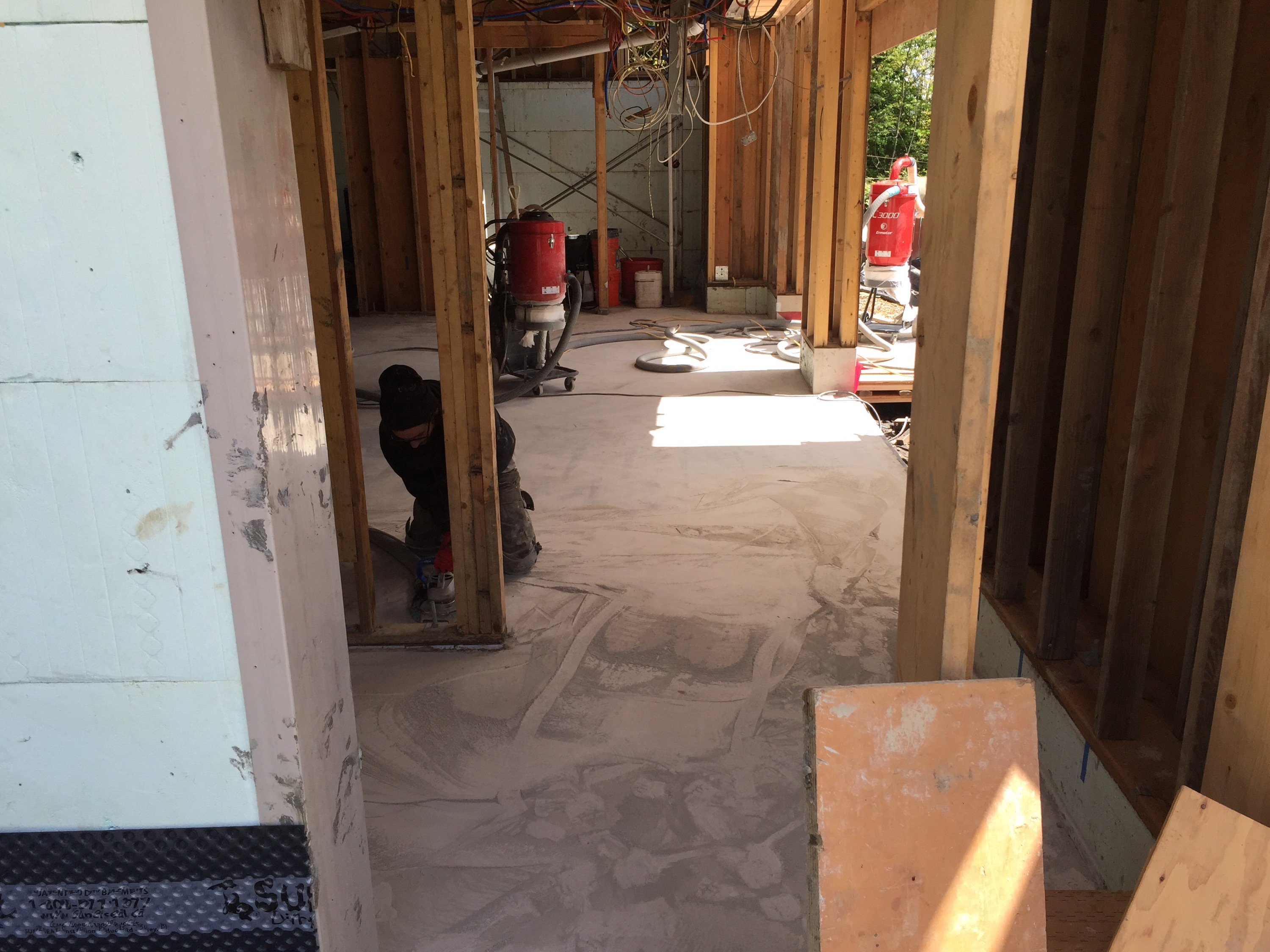 A ramp had to be made of all available plywood and much of the available lumber so that a 1000-pound machine could make its way into the space. This effectively halted the framing last week, but that machine came through and polished off the rough and ugly remnants of a difficult concrete pour in December.