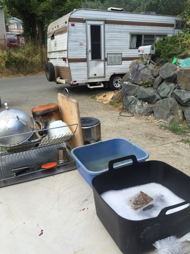 We lived for a week without plumbing again. We pulled the trailer up and used the potty in there, and I did our dishes in the driveway. Warm dry weather makes that not as big of a deal, but I’m glad it was only a week.