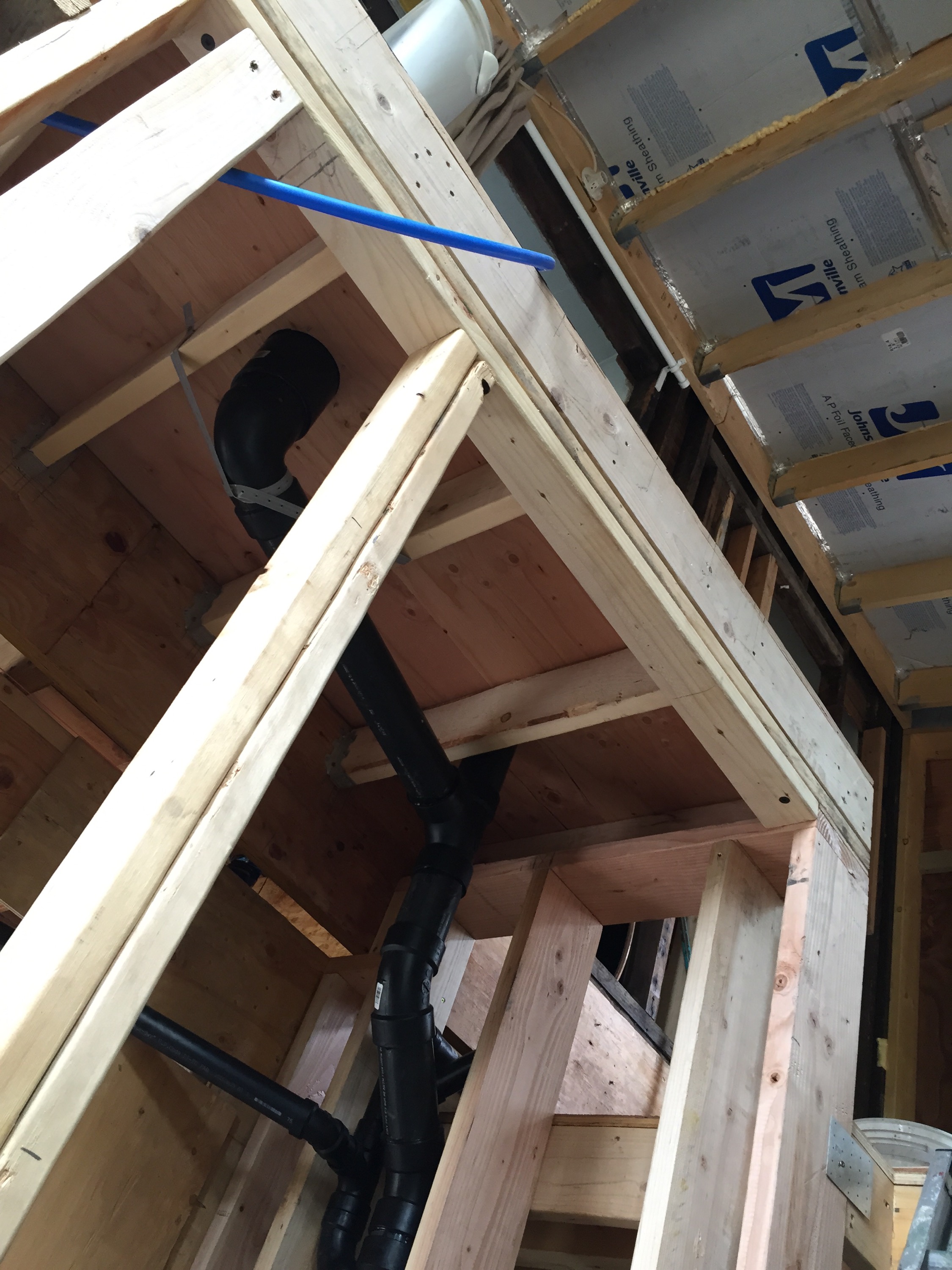 The rest of our plumbing is temporarily hooked in again, too. There was quite a bit of head-scratching and figuring about the placement of future fixtures before that happened.