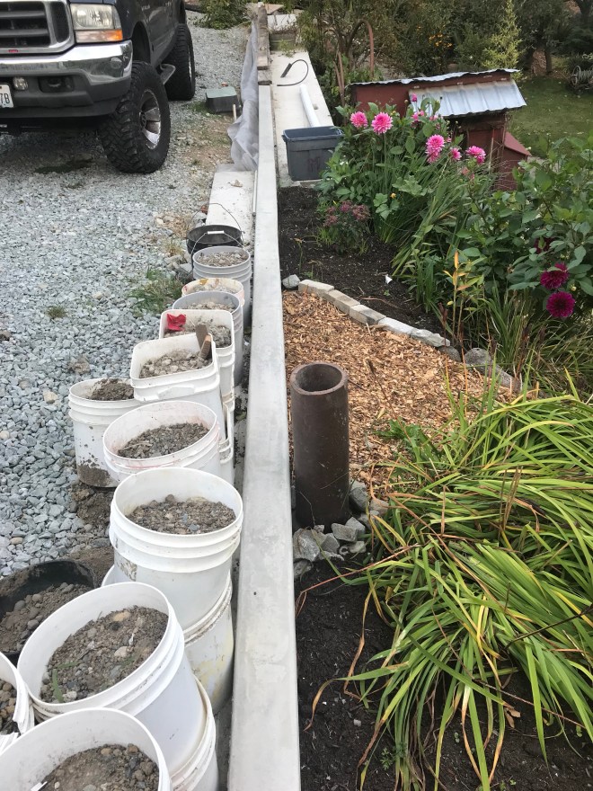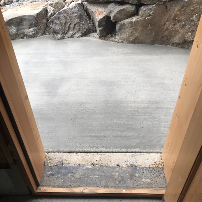 The other big piece of concrete work we got done last month was this “curb” on the top of our lower rock wall, and the pad at the front door landing.