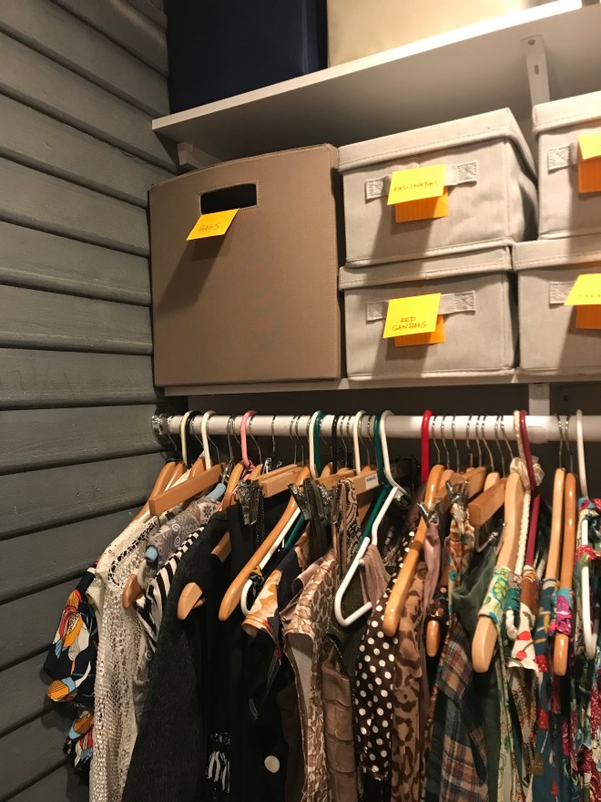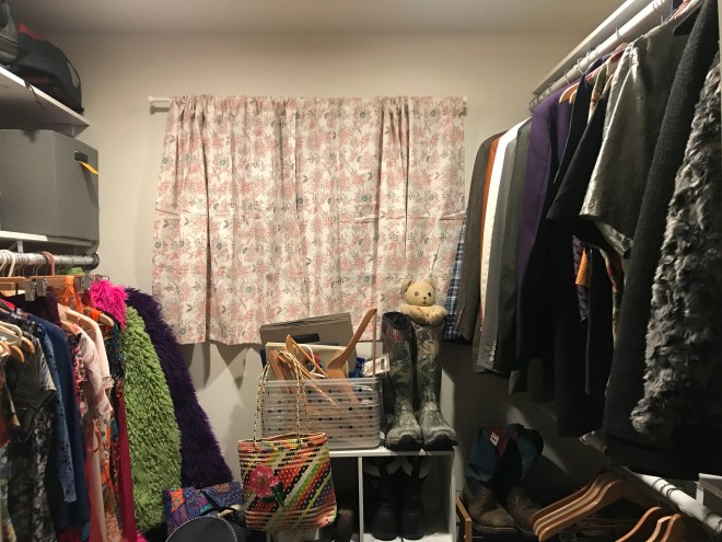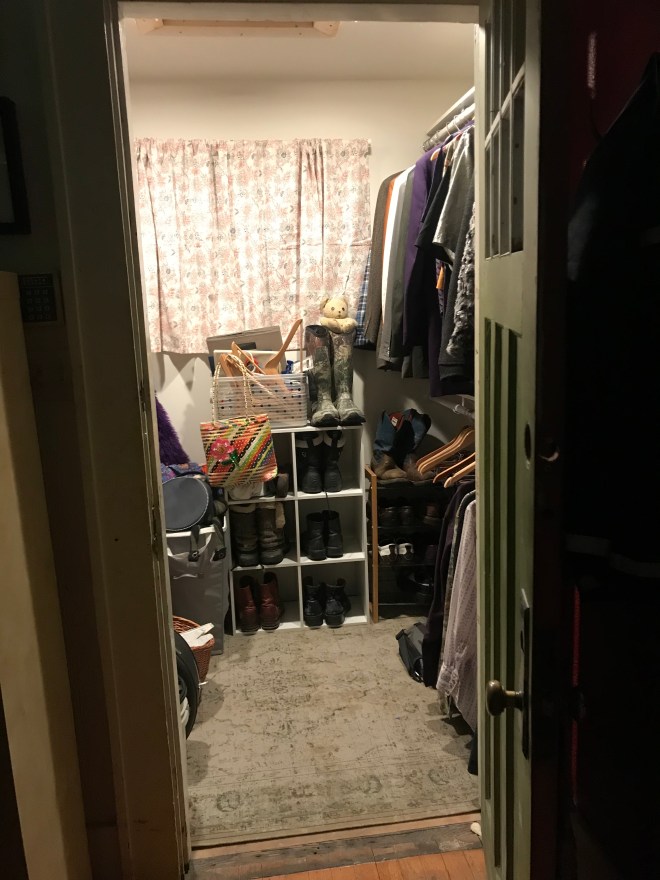 When I came home with all my stuff in March, I had to pack the non-essentials into bins in our loose insulation-filled attic because I no longer had a closet. The house was built in 1924, when people were less clothing-endowed and the closet in our room fits only Morgan’s things.