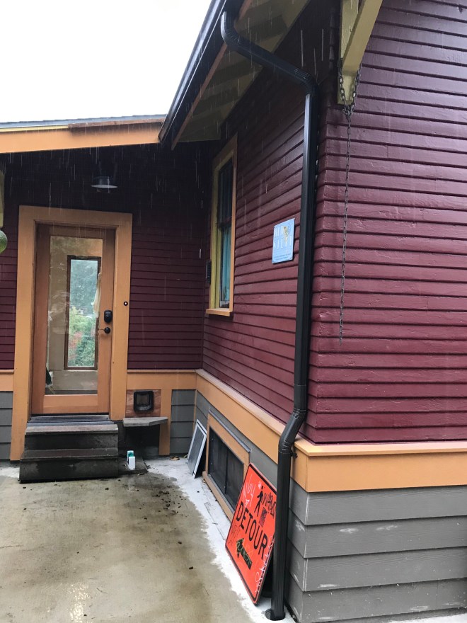 Gutters! They’re not glamorous but they sure are helpful. We really need a new roof as well, but gutters are something we need to finish the permit and the roof should hold a little longer. Next we need a city-mandated cistern and then we can complete the side sewer/drainage permit for good. In the meantime we no longer have to duck through a curtain of water to get out the front door when it rains, and the door itself will stop being ruined by splashing water.
