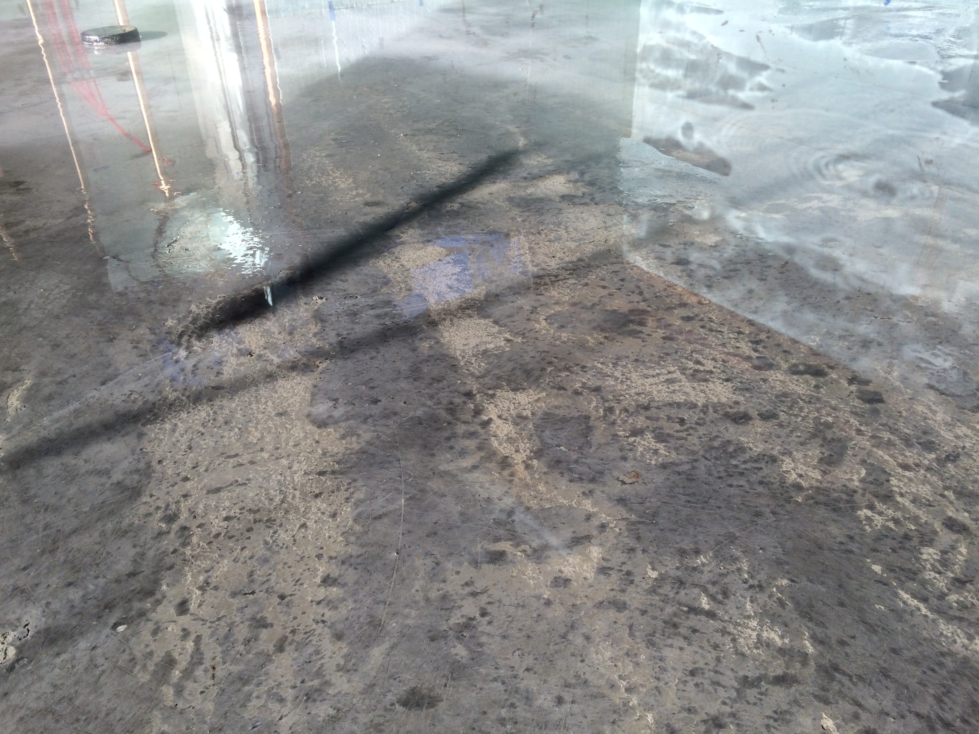 Capti’ Andy, Flaster kept me company for those hours. Shooting the shit, drinking beer and waiting to get out on the mud. They wanted to leave but I wanted a hand getting the power trowel on the floor. By now I could still get my thumb in the mud past my nail, no good, too soft. I was worried about the back section so I toss a pebble back there and it fucking bounces and clatters across the floor! Shit thats bad. No chance to wait on the front half, we grab some foam panels and wrestle the trowel across the soft bit to the really hard bit in the back. Way too hard. I can barely knock down the ridges much less get any creme’ to fill the voids. I plead for continued assistance from my unfortunate pressed brethren in strife. Nothing much I could really do at this point. The hardened half was nigh unworkable. I concentrated on the areas that will be seen and most left the hidden parts alone. Big patches went left un-trowled, mountains and valleys, folks. Like lava. Trying to transition the two batches was impossible. One half had the trowel skipping, the other just swallowed the blades. I had no chance to detail in the edges or flushed features such as the floor boxes and basins. I kept the power trowel going on that bit as if doing it more would help. Not really ‘though. I got a fine hard sheen going but only on the high spots. The voids would stay that way.