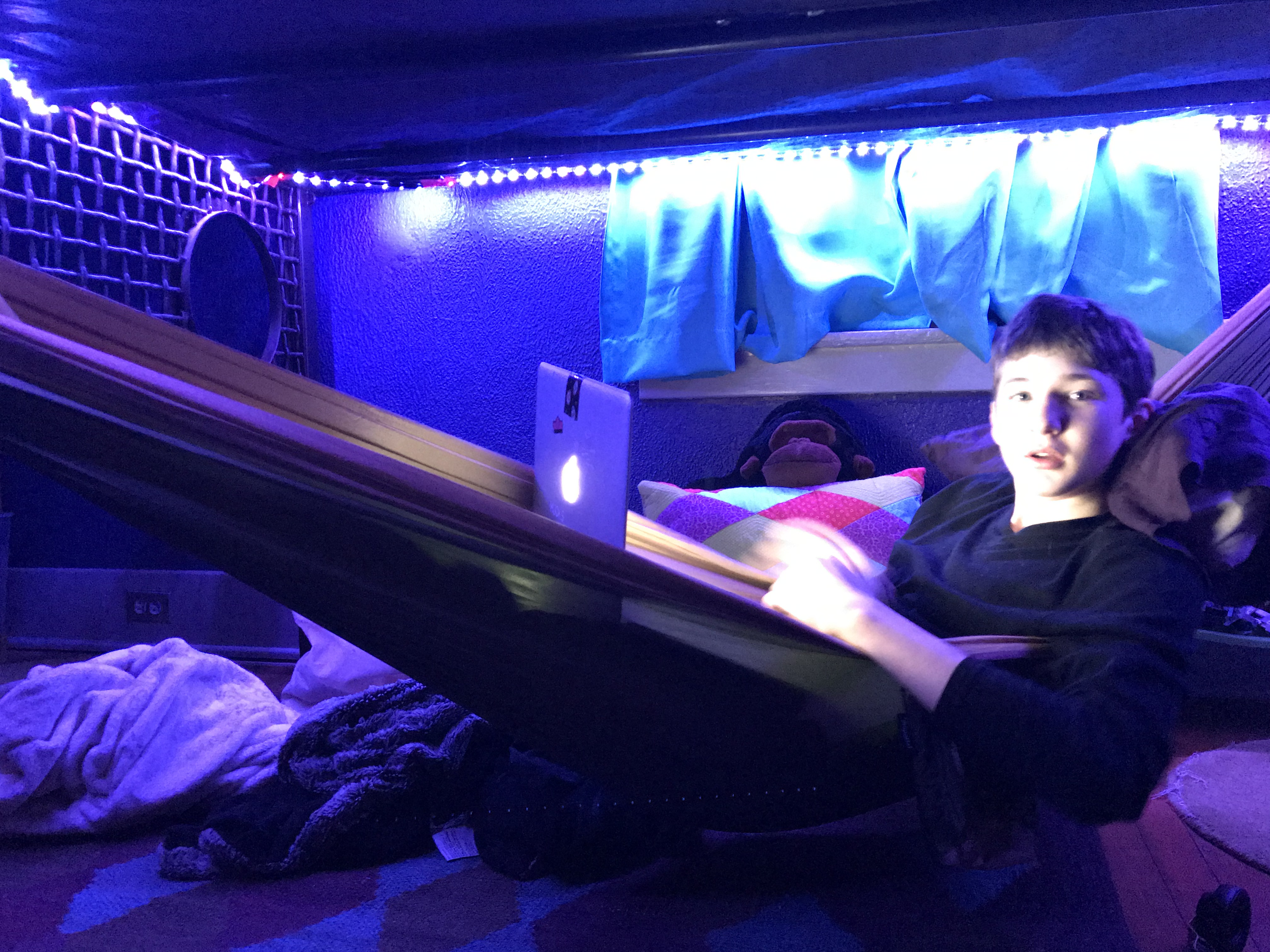 For Christmas, he got some LED strip lights and a hammock, among other things, to really bring it all together. He is hanging out there now…