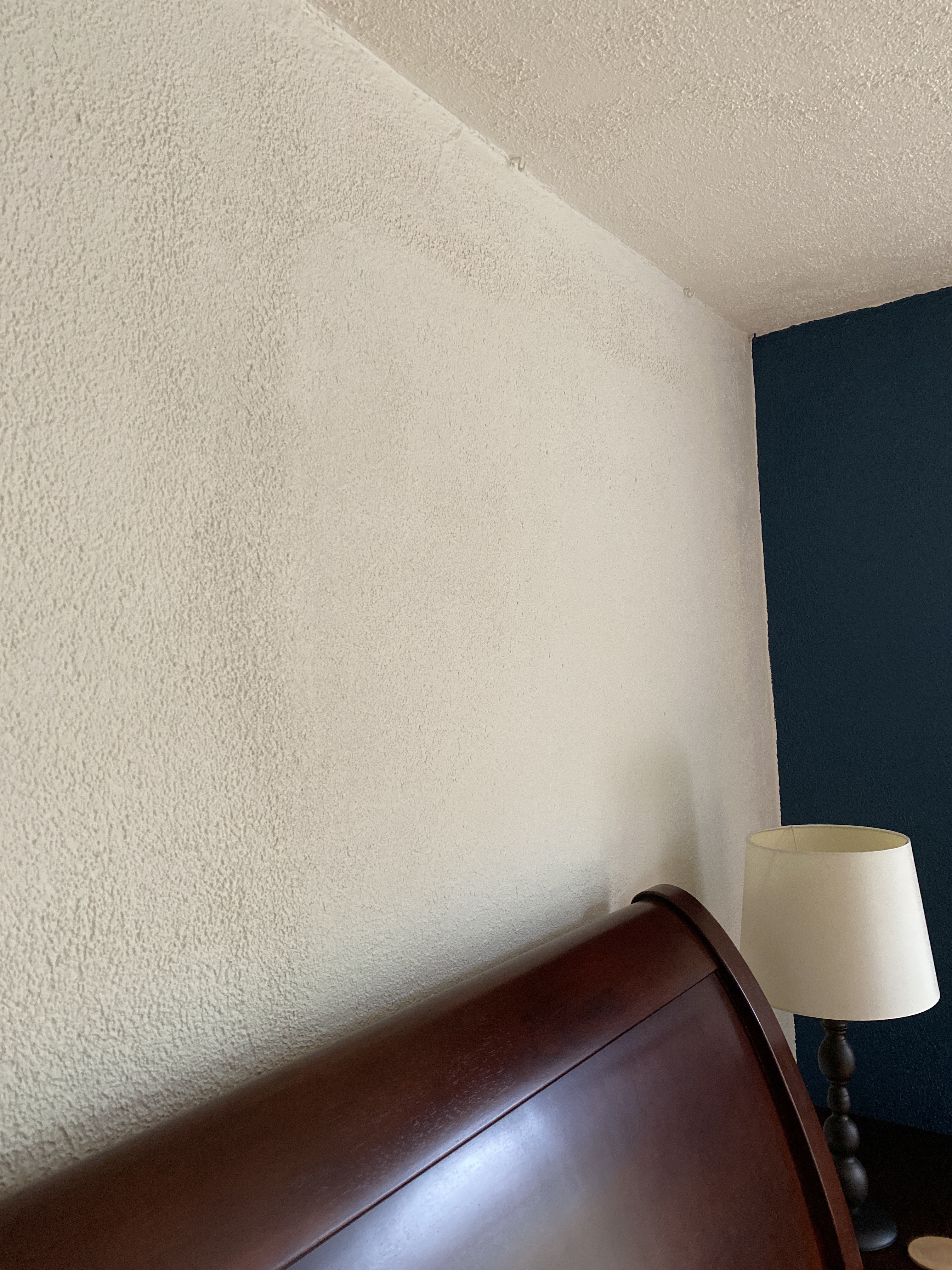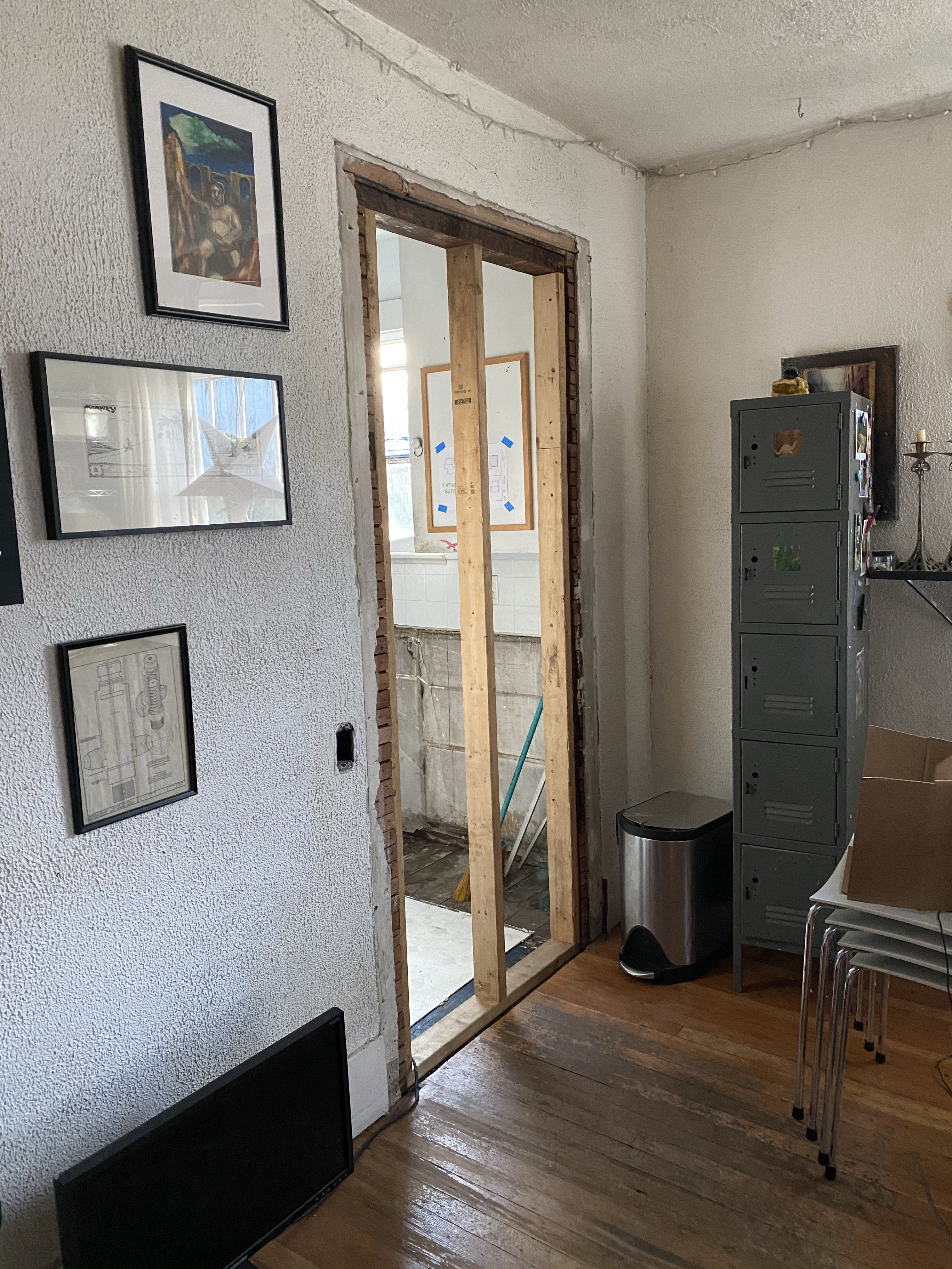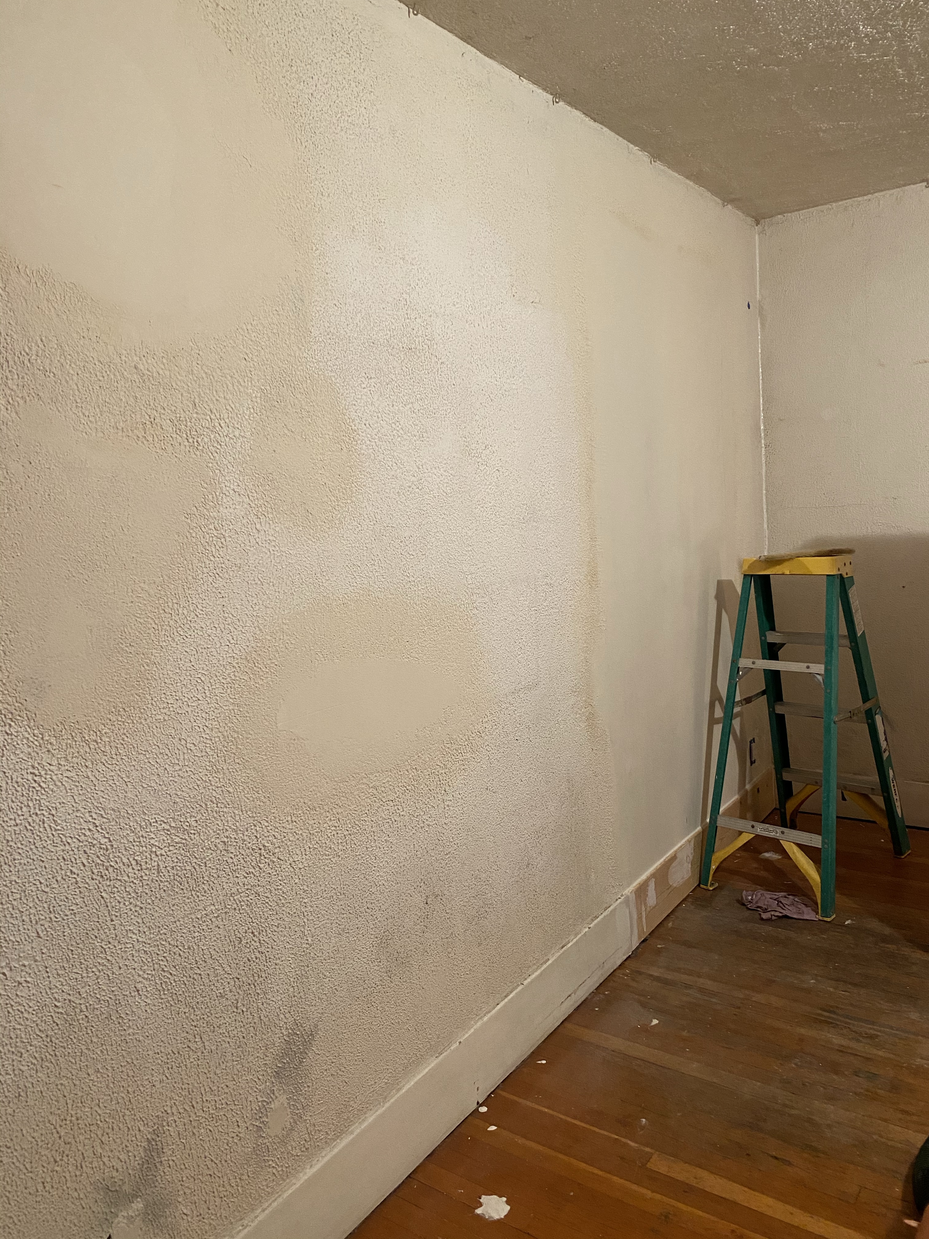 Having moved into our new living room downstairs, we are transforming the old living room into a bedroom. This is the simplest small job in the very complicated large job, but it did require covering what was the door between kitchen and living room and patching a lot of plaster. The old plaster has a texture, and while Morgan is usually a perfectionist prone to spending too much time trying to get it just right, he has recent been heard saying, “Dying time is coming, I want to enjoy this house before I go.” Indeed. Plus, this little 1924 bungalow was never a fancy home; the original plaster work shows all kinds of funky lines and splotches, and it seemed silly to obsess over something we will mostly hide with furniture and art.