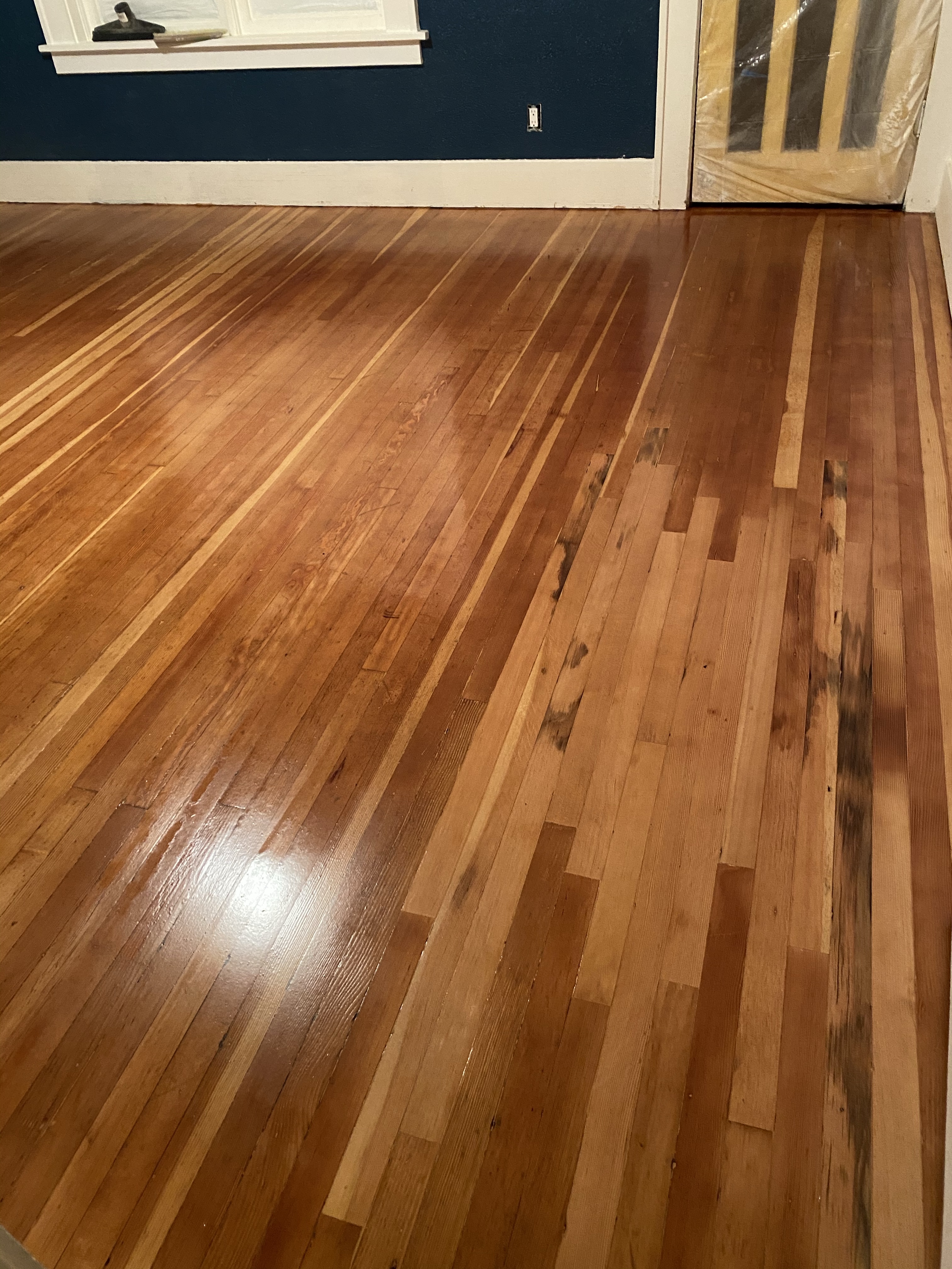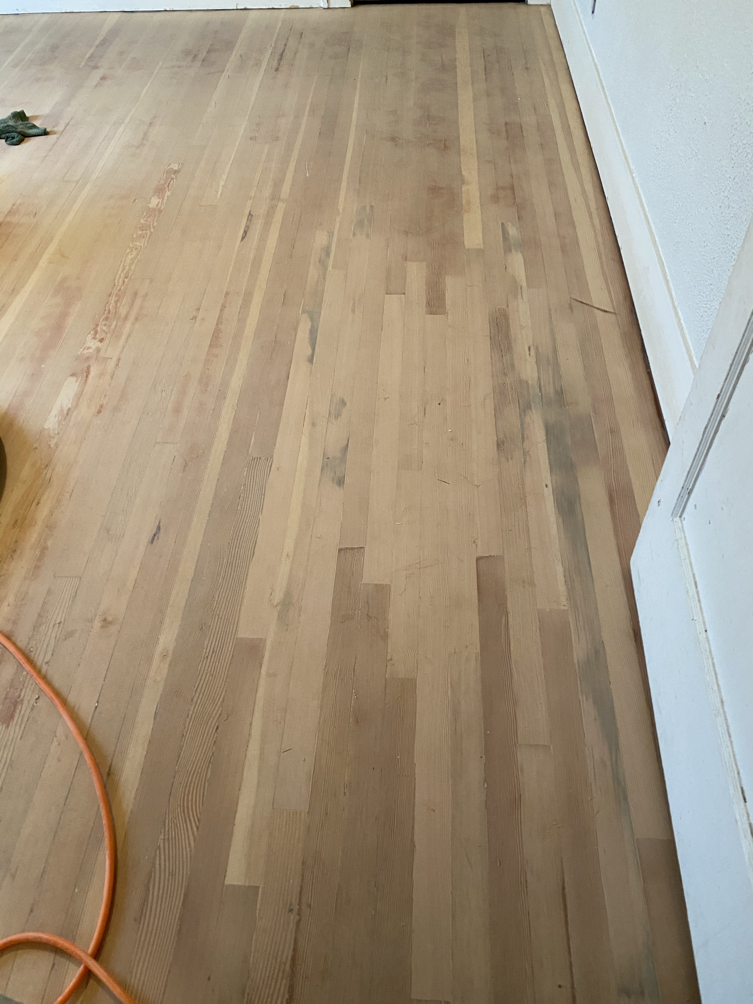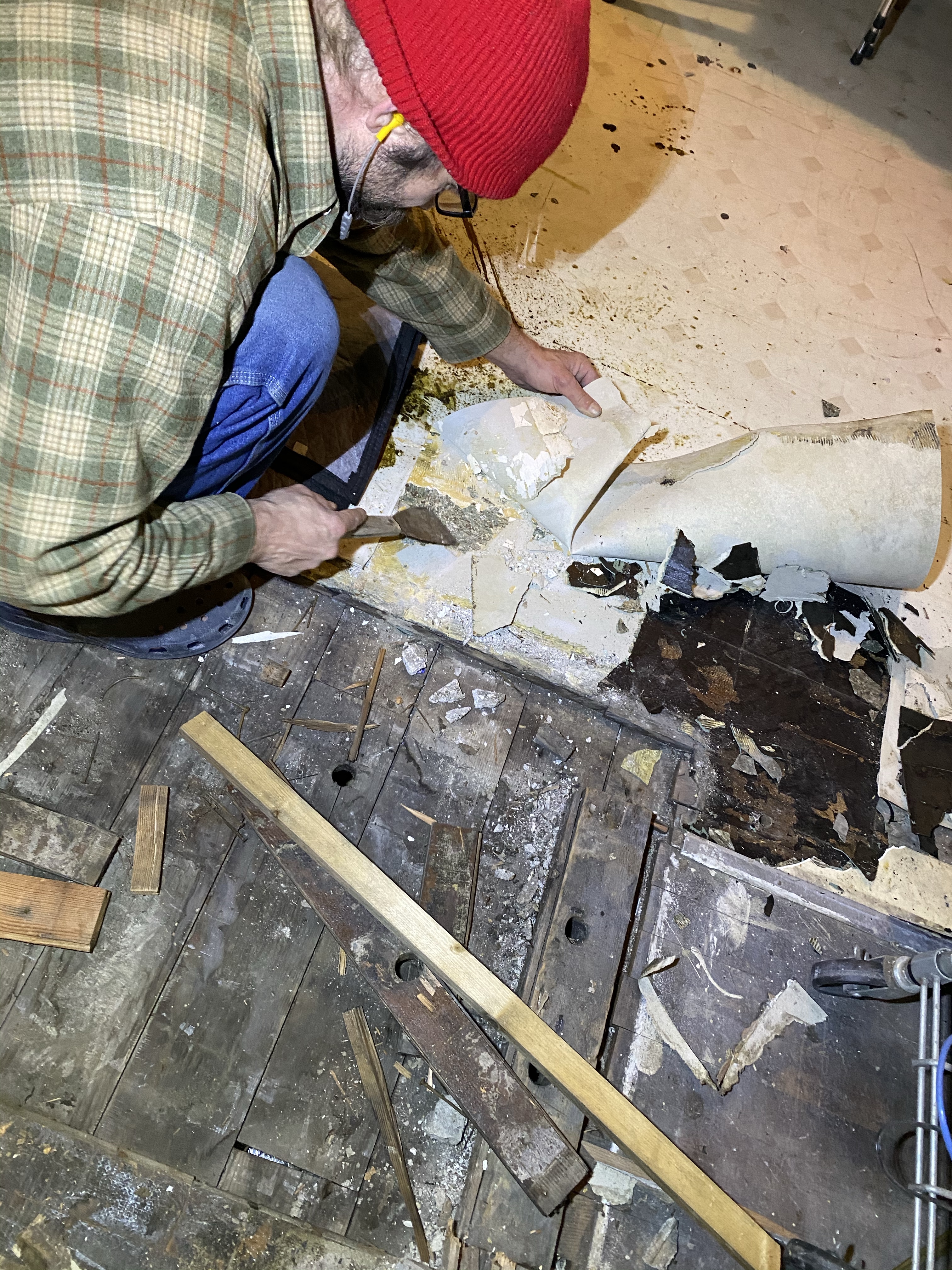 Longtime readers may recall the hole in the floor that for a time was a direct shot to the outdoors. We assume there was some kind of heating system that it served before our time, but for us it had always been a dust bunny nest and place where small things gathered to be lost. A plywood patch has been adequately serving to fill the hole but it was time for integration. If I understand Morgan correctly, there is continuous fir flooring underneath whatever other surfaces we walk upon in this house, so he decided to take some from under the two layers of linoleum of the old kitchen/future bathroom where we won’t be needing it. The wood there has been covered for at least sixty years (based on that first layer of linoleum) if not longer, and was covered in a tarry substance, so it wasn’t going to look exactly the same without a lot of work or a stain job. There are also a couple of spots that got really beat up by a rolling chair and tons of dings and dashes in the existing floor that no amount of stain or work could really hide. We decided we are fine letting the patch stand out. There was a hole there, that happened. Life has been happening here, no obscuring that.