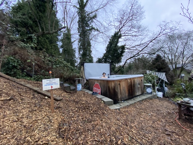 This particular spot hasn’t gotten much love from us in terms of landscaping. Once upon a time it was where our three-bin compost storage was. Then it was a place where we stored all the stuff that needs a shed but doesn’t yet have one (you can see where we moved it- the orchard ladder and scaffolding to the right in the photo). Eventually the slope to the left in the photo will be dug out and carted away, but for at least a few years we will have to work on beautifying it as it is. For this mid-winter moment, just sitting in a tub of hot water for as long as we want to is a beautiful thing.