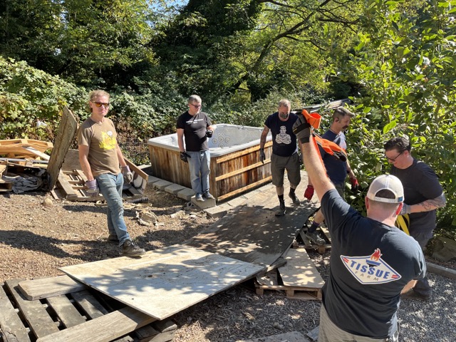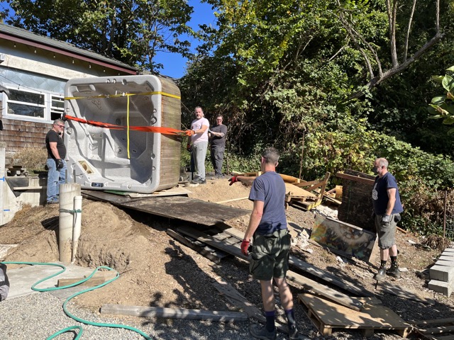 The tub is BACK! Here are a couple of photos of the big move back in mid-October, with big thanks again going out to our helpers. Some of them helped us move it into place originally and they STILL showed up for this awkward heavy job. Y’all are the best!