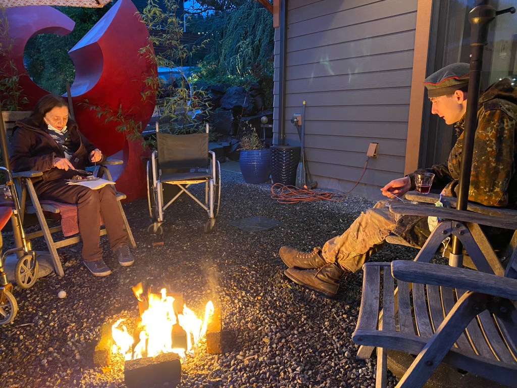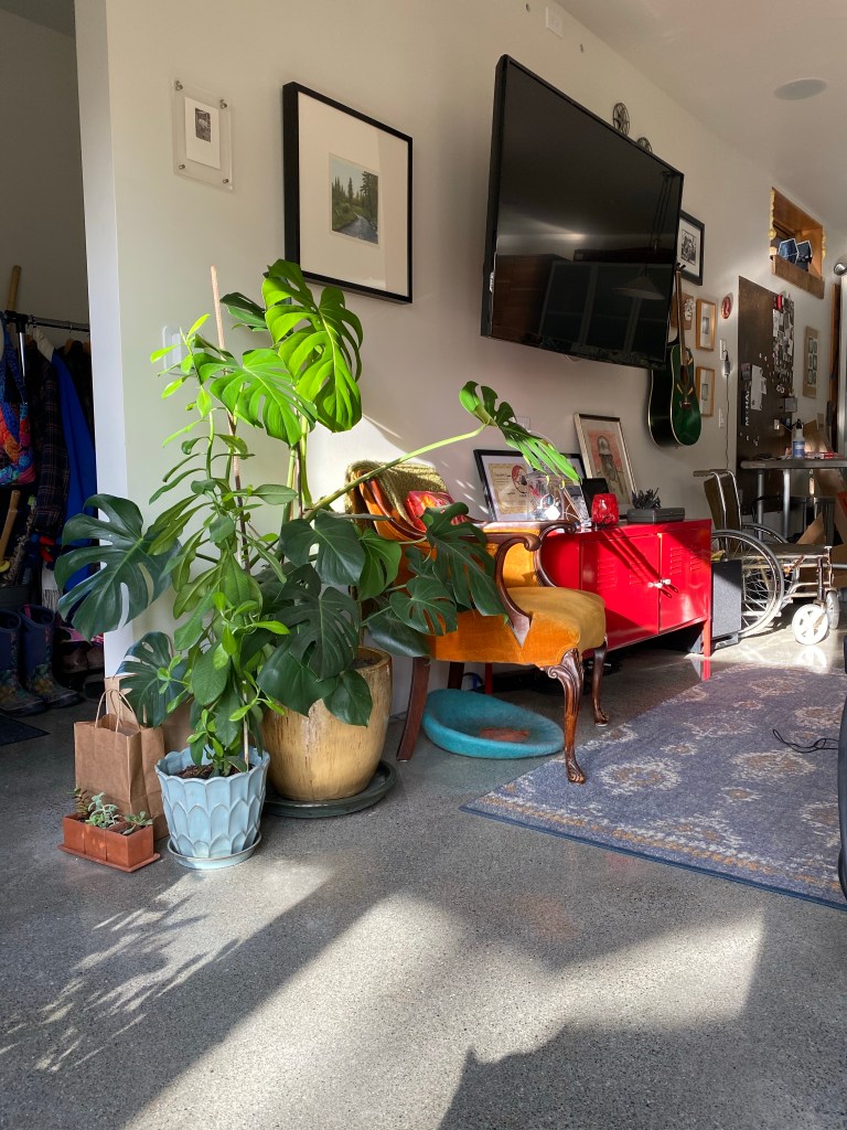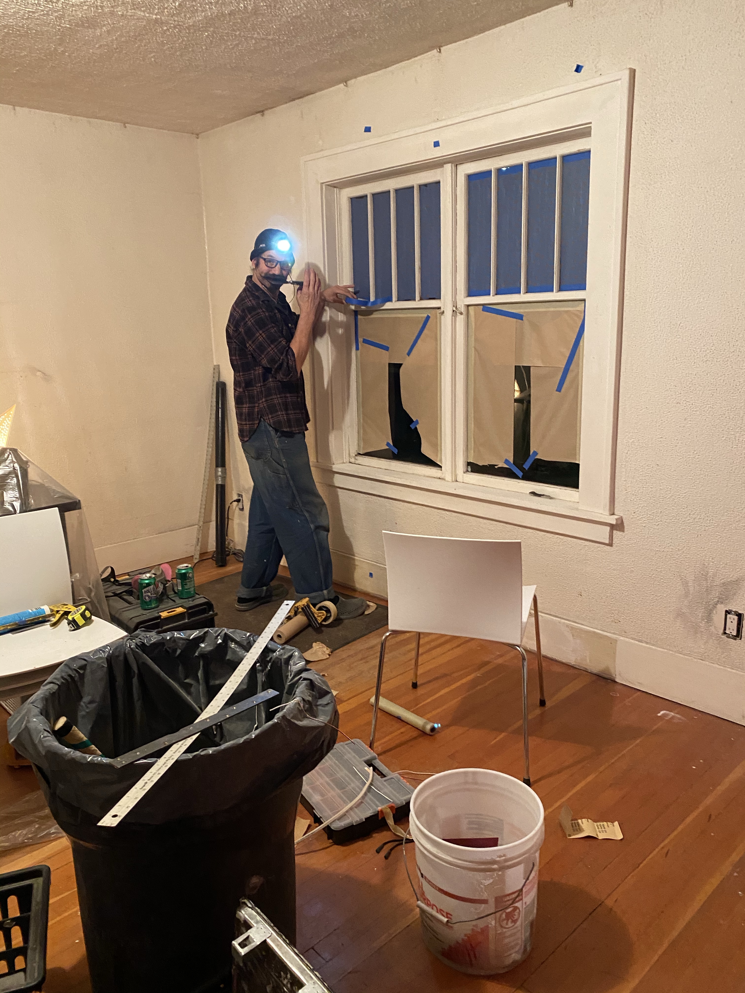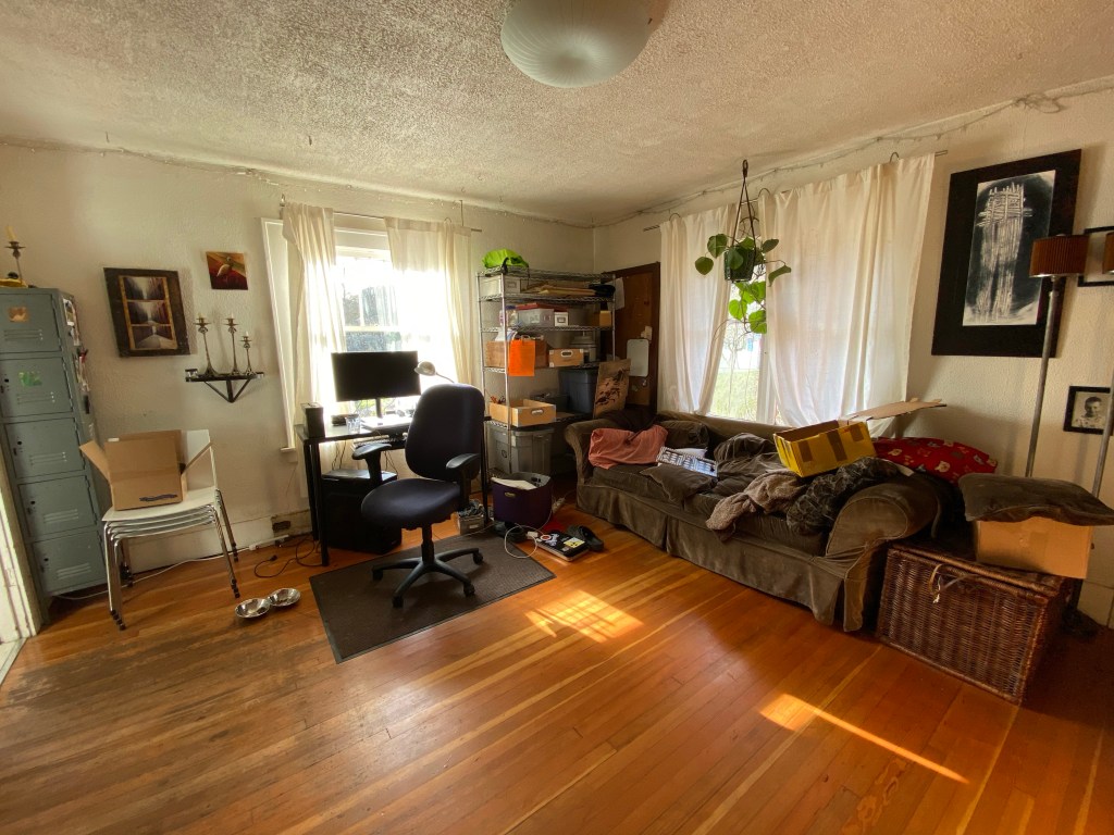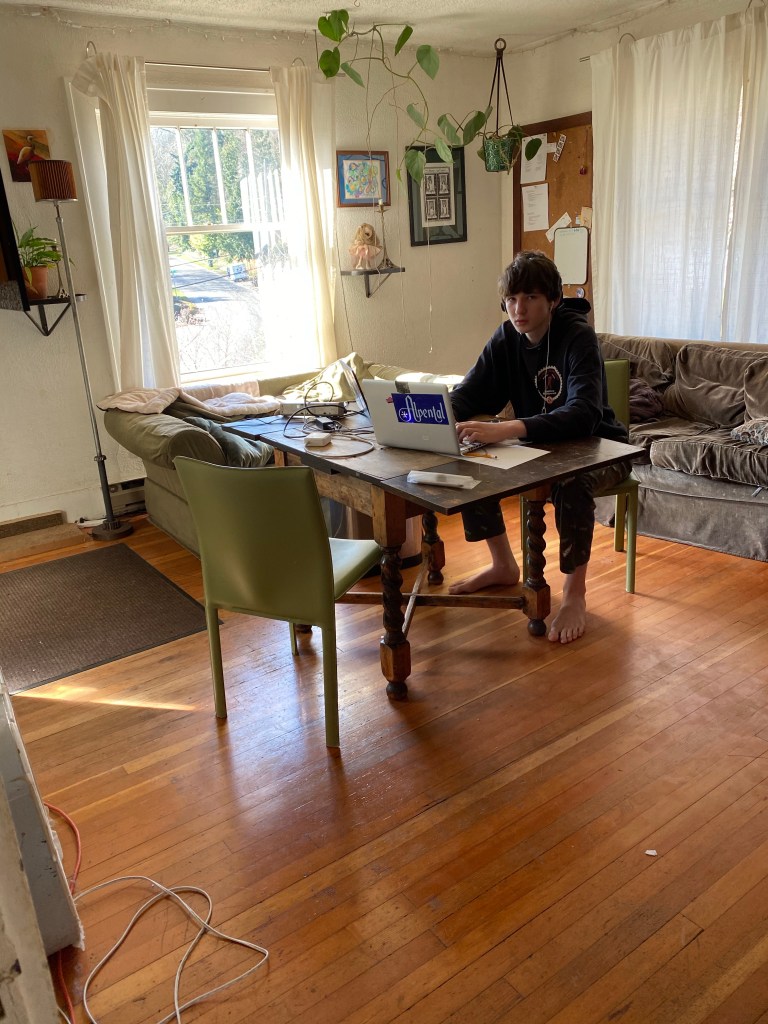 All of this displaced Huck’s virtual school and workout station to the dining room where he set up his new desktop computer which took over most of the table. While we enjoyed seeing him a lot more and interacting with him around whatever game he was into, it also meant that we had to compete for audio space if we wanted to watch TV, listen to music, or talk. This meant that rather than taking the time to paint our old bedroom or unearth and refinish the fir floors in there we left the 20-year-old paint job and replaced the ratty old wall-to-wall with some carpet tiles and called it good for now.