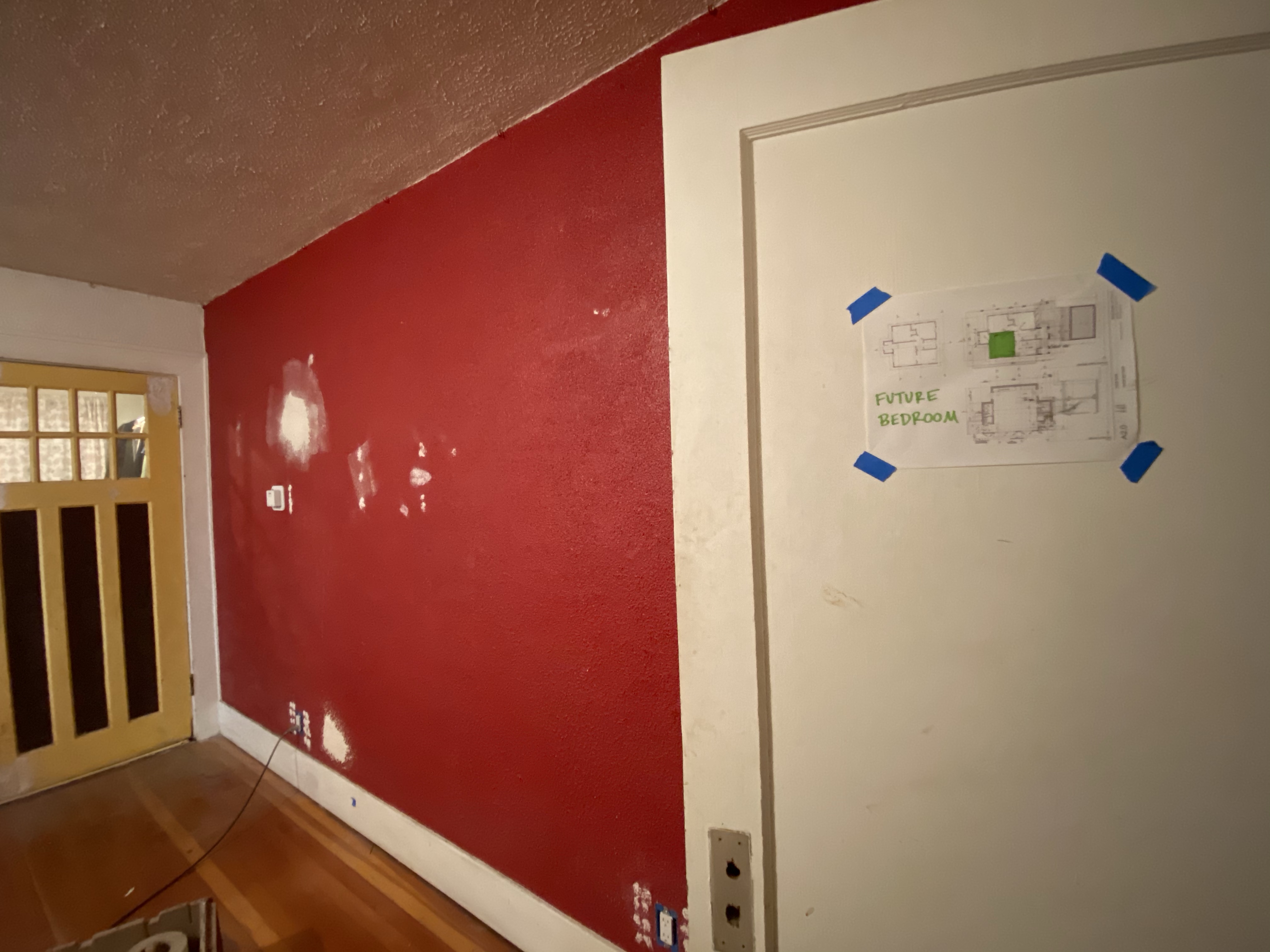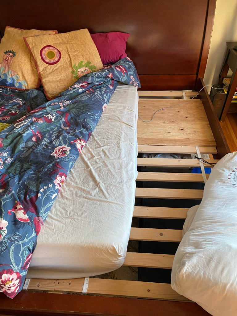 I woke up a couple of months ago and announced that I couldn’t take it anymore. We have been sleeping in a squishy old double bed that was Huck’s until he grew out of it. It was a temporary (2 years now) arrangement that had reached my limit. We had decided that the next bed we bought would be king-sized, but that could only happen if we finished converting the old living room into a bedroom because our existing bedroom would not accommodate anything larger than a queen. Morgan loves me; he got to work.
