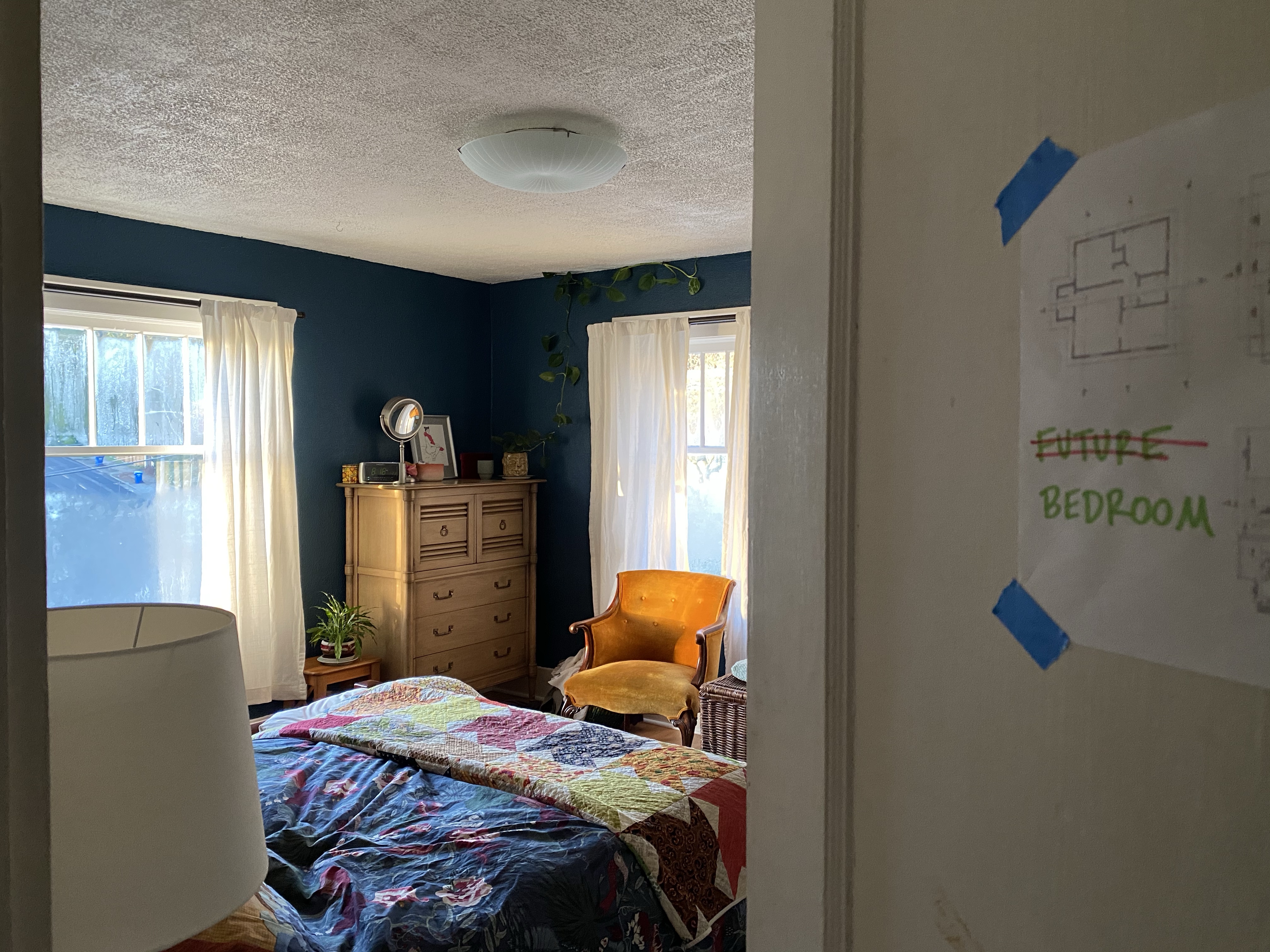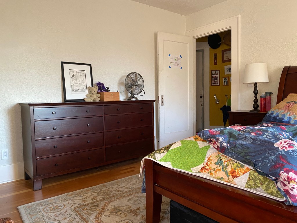 We have more work to truly complete the transitions upstairs— doors and door trims need painting, some furniture needs to be shuffled around, art needs to go up— but this weekend we are taking a breather. We are sleeping in the new room! It’s so cool! Annnd… the mattress we ordered to fulfill our king-sized dreams will not likely be delivered for several weeks, so we are still on that crummy double bed floating on a gigantic bed frame. The anticipation is killing me! But whatever, I am more than fine; what a joy to have this fresh perspective to wake to for this new year.